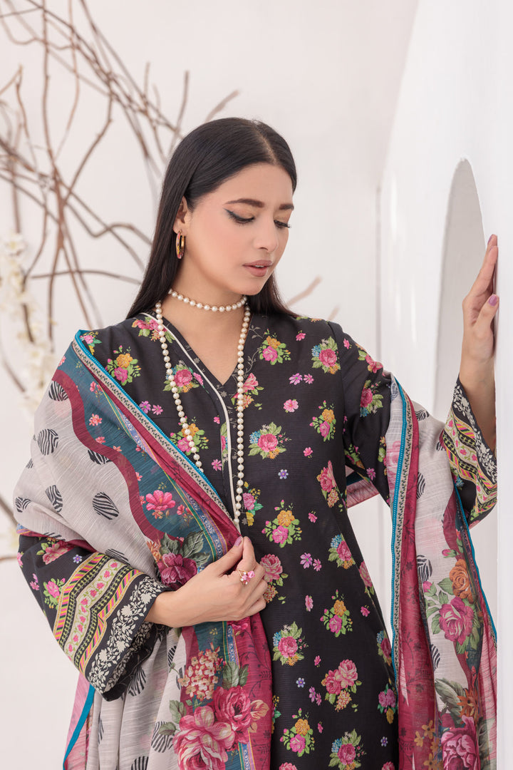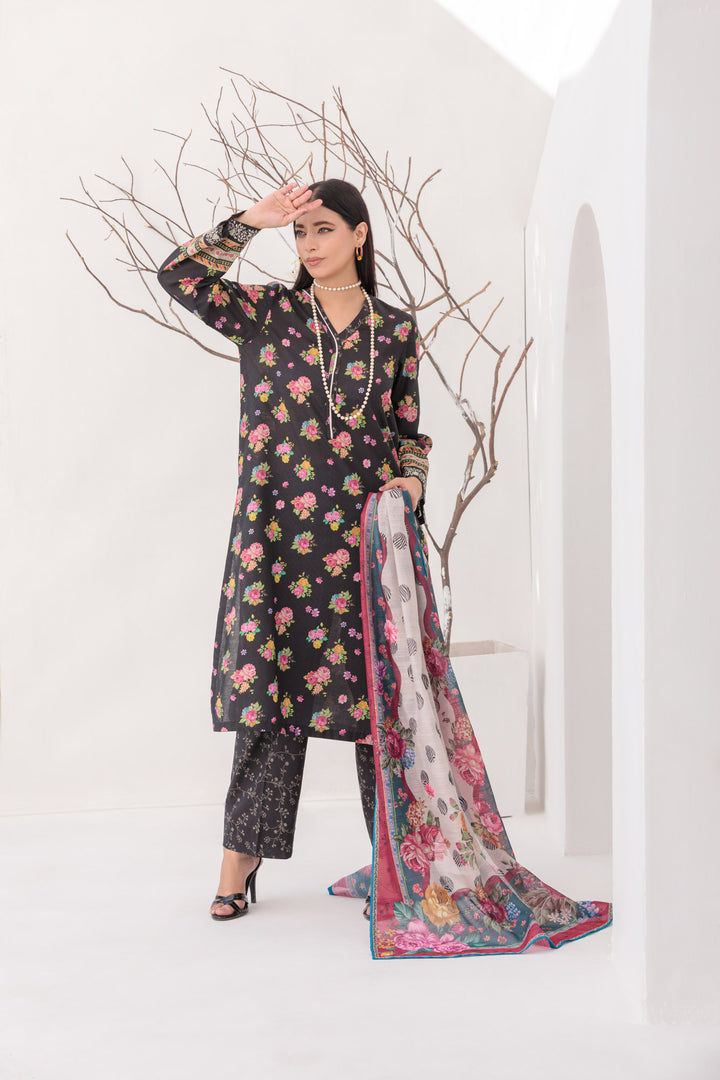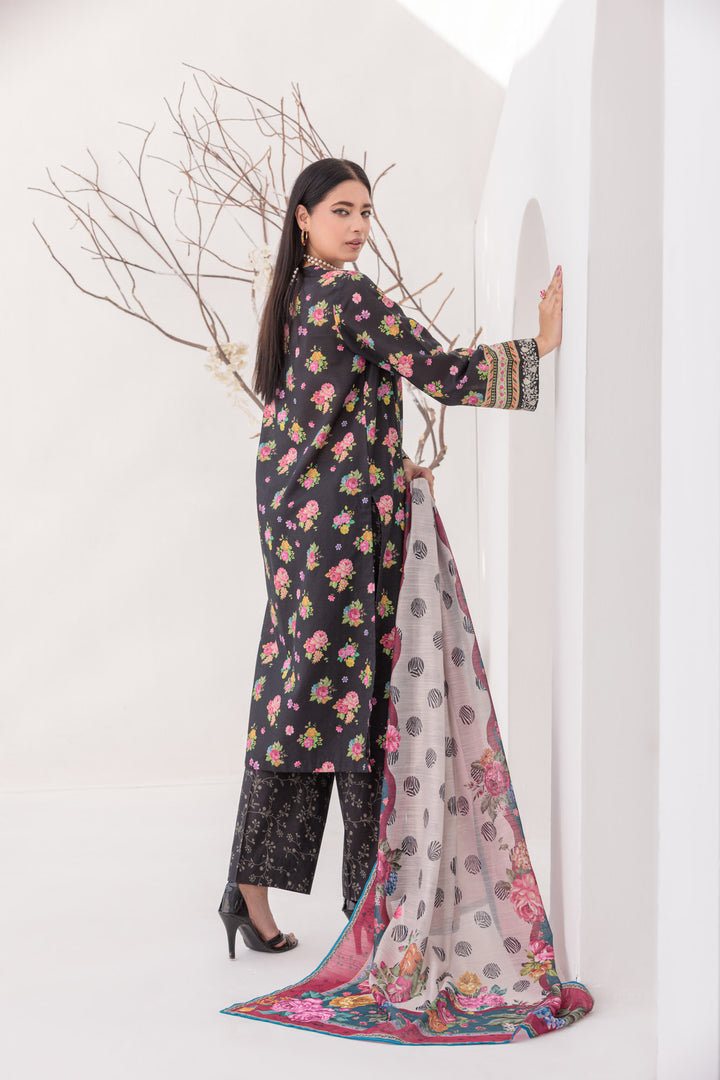 Design: Digital printed shirt, Digital printed Trousers Digital printed dupatta. This textured black and grey three-piece is unified by a seamless, high-impact digital print covering the bana dora shirt, cambric trousers, and monark dupatta.