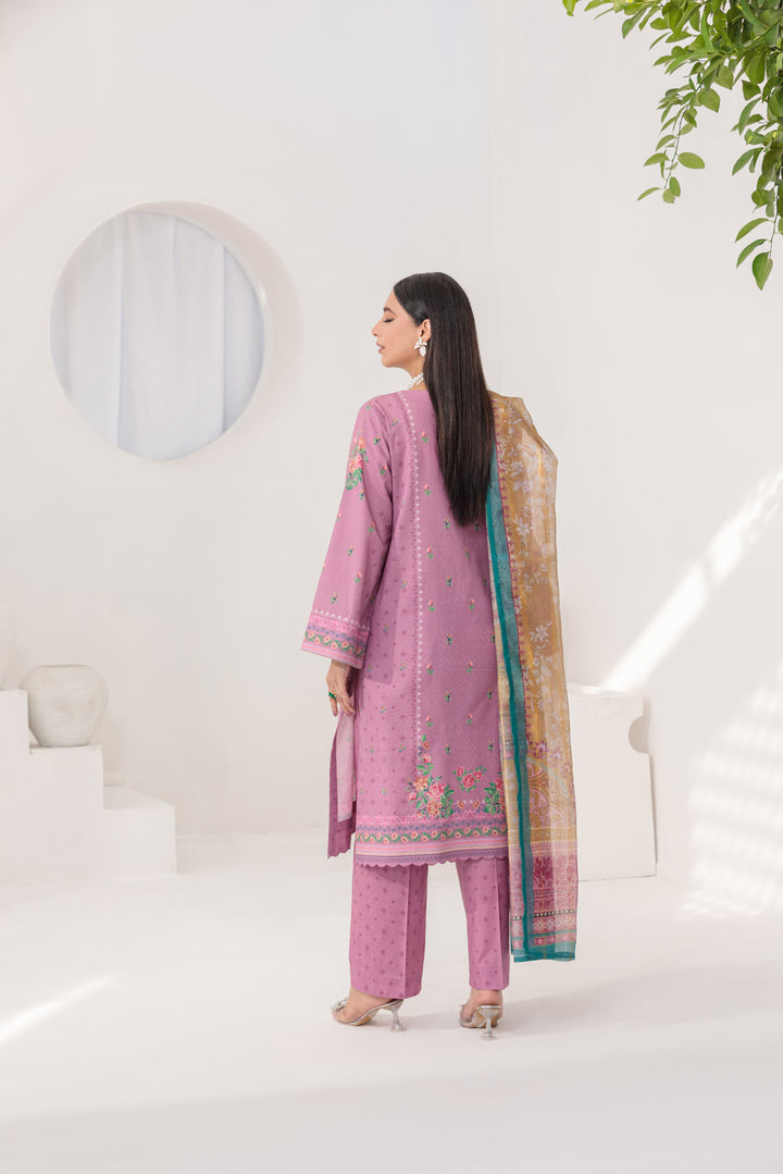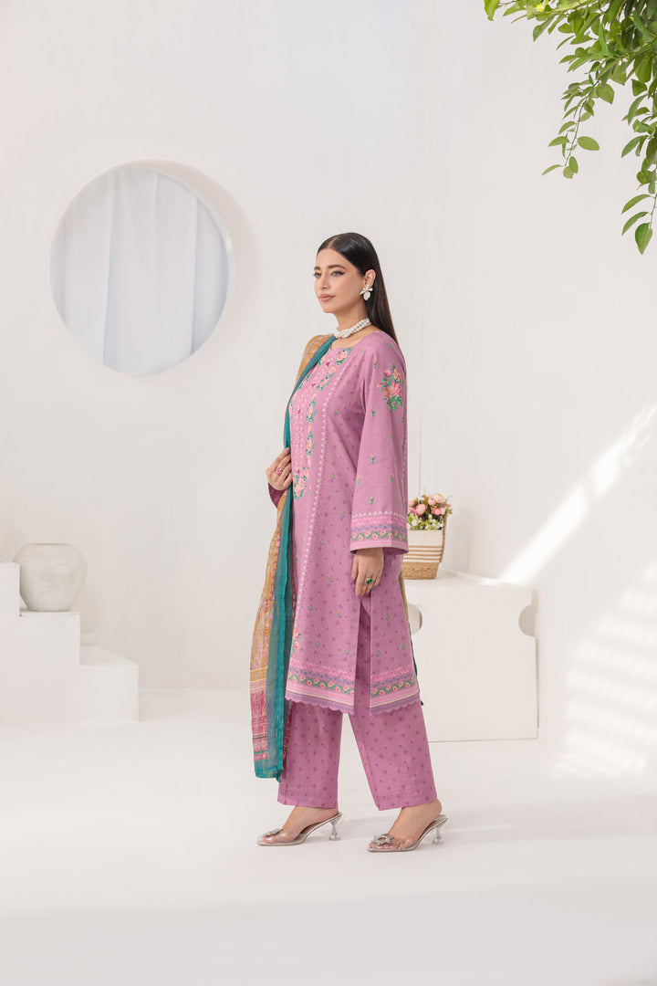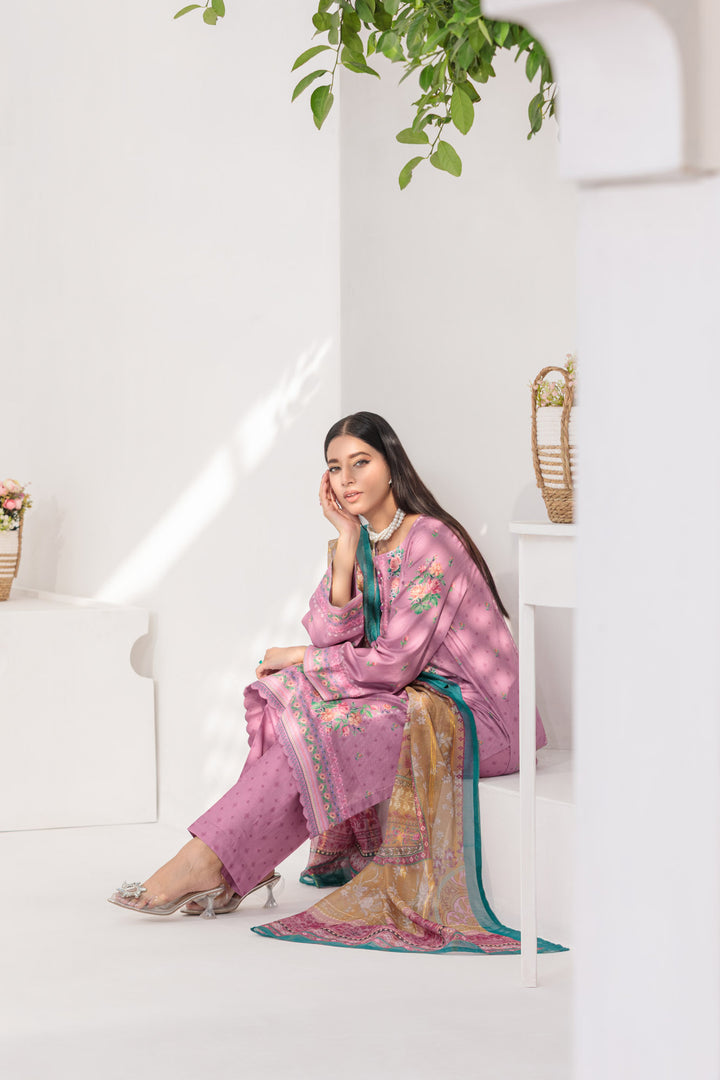 A charming lilac and yellow Bana Dora ensemble, showcasing a beautiful digital print shirt, complemented by coordinating digital print trousers and a graceful dupatta.