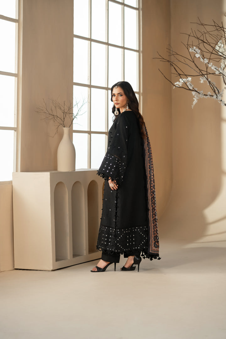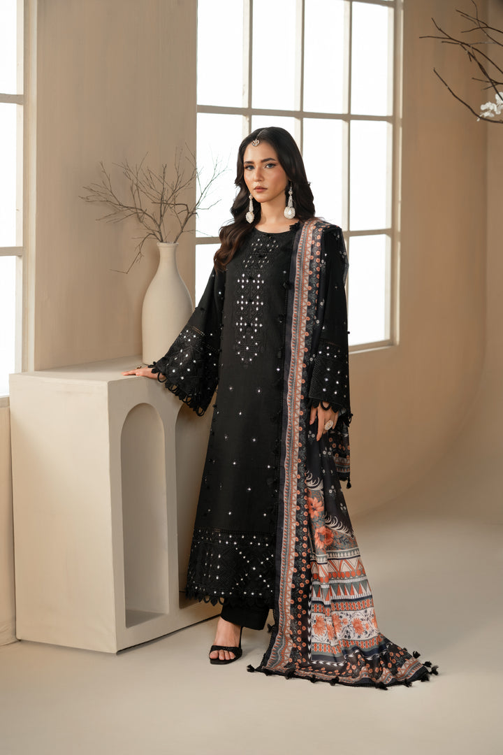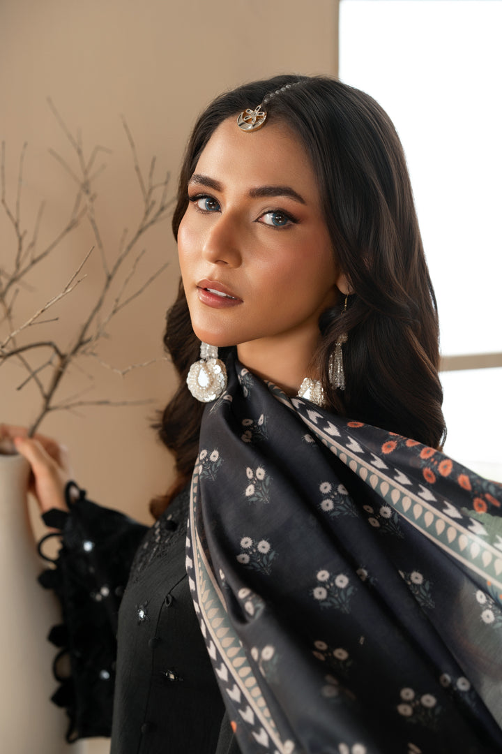 A classic black outfit with an embroidered cambric shirt, dyed trousers, and a printed dupatta.