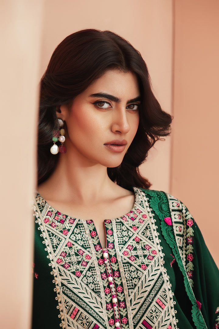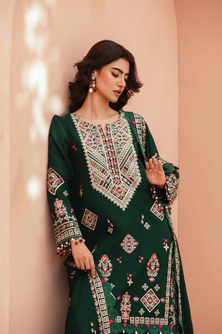 Dark Green embroidered shirt, paired with dyed trousers and a dyed Shawl.