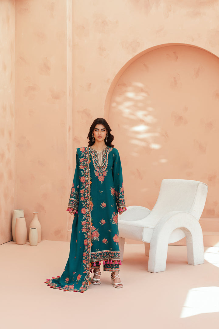 Teal embroidered shirt, paired with dyed trousers and a dyed Shawl.
