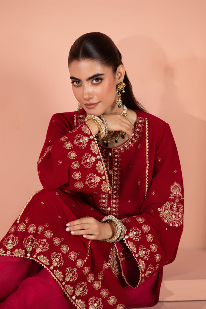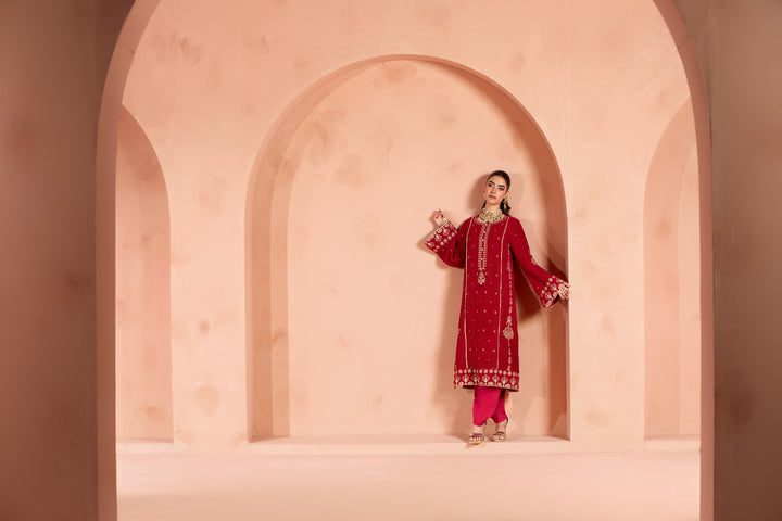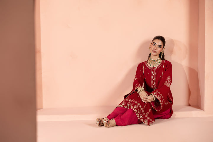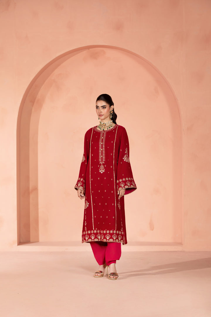 This hot pink velvet shirt is adorned with delicate embroidery, featuring an embroidered neckline, side panels, hemline border and embroidered sleeves.