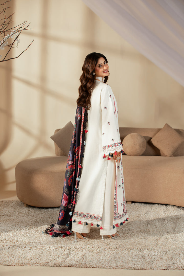 An off white outfit with an embroidered jacquard shirt, plain trousers, and printed voile dupatta.