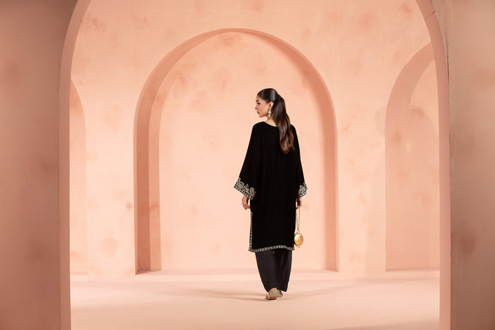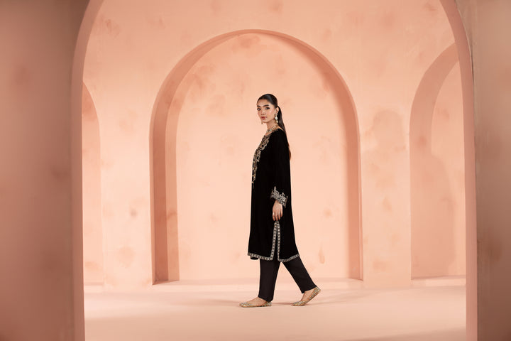 This elegant black velvet shirt is enriched with refined embroidery, featuring a composed embroidered neckline, embroidered sleeves, and a delicate embroidered border on the hemline.