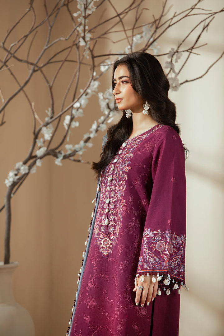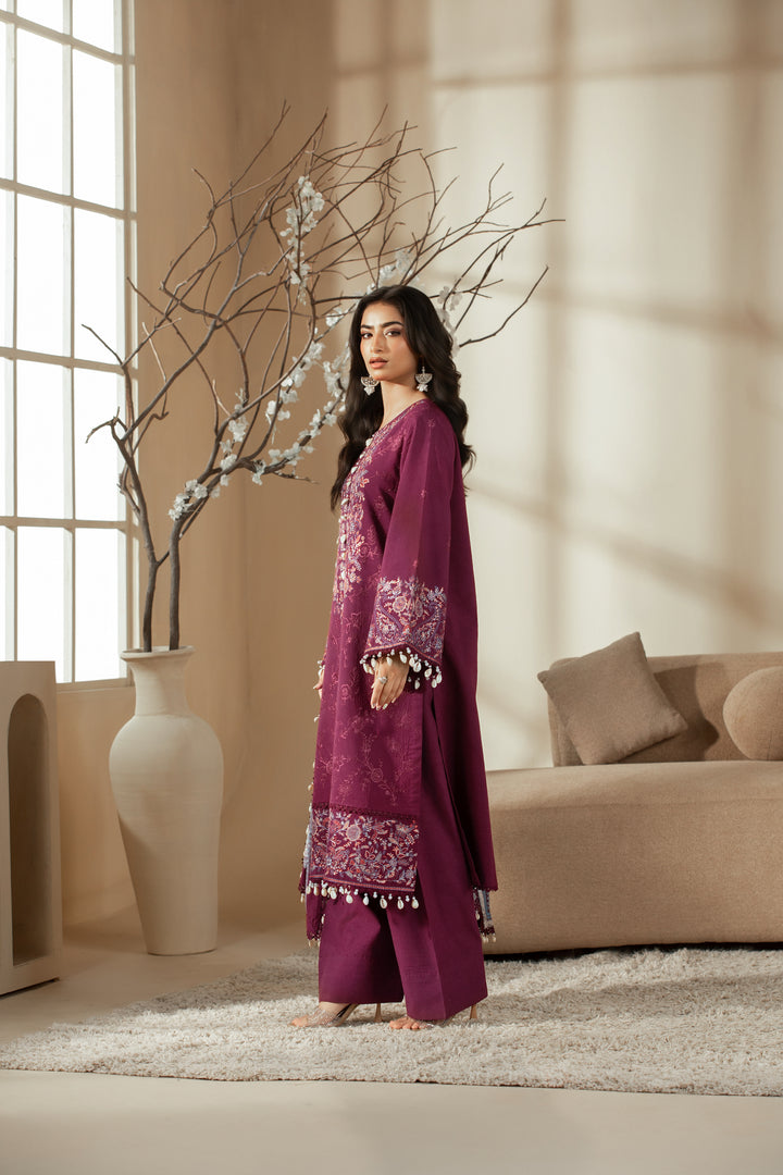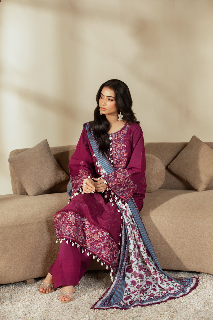 Plum embroidered shirt, paired with dyed trousers and printed voile dupatta.