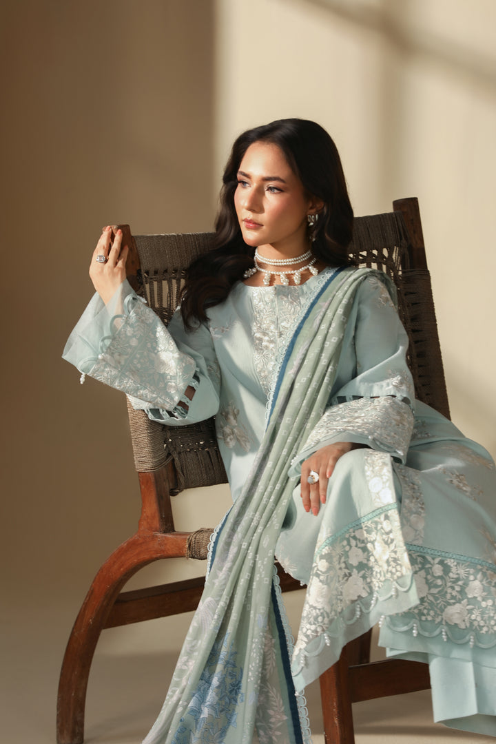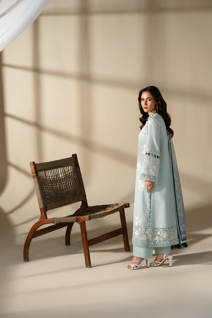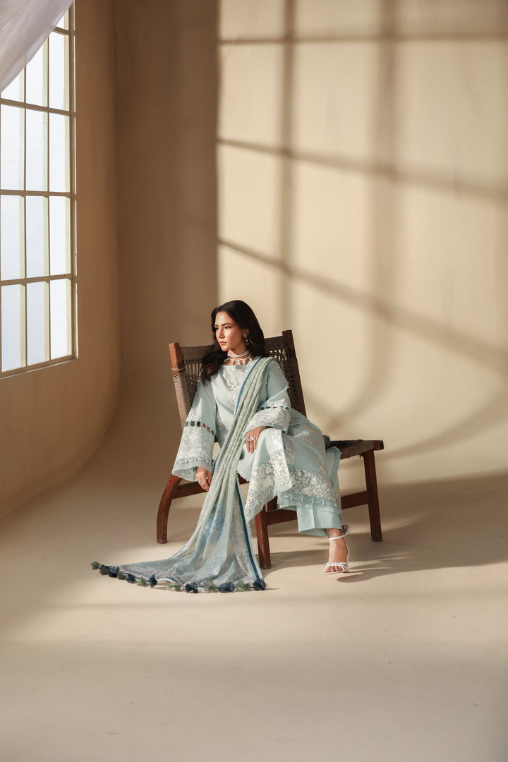 Aqua marine embroidered shirt, paired with dyed trousers and printed voile dupatta.