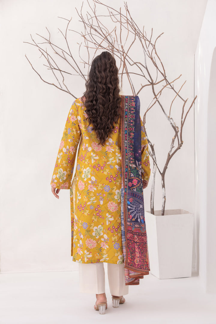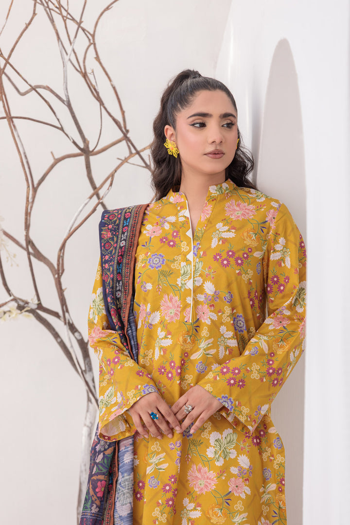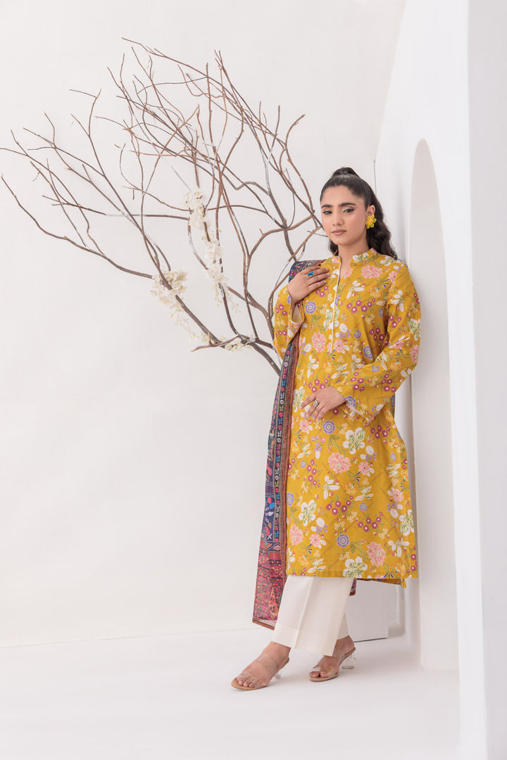 A mustard and blue cambric outfit with a digital print shirt, paired with digital print dupatta.